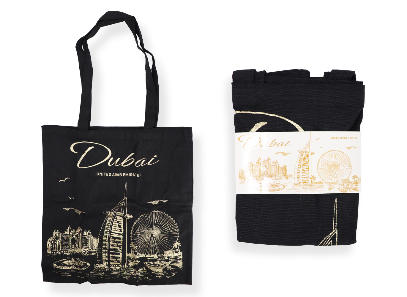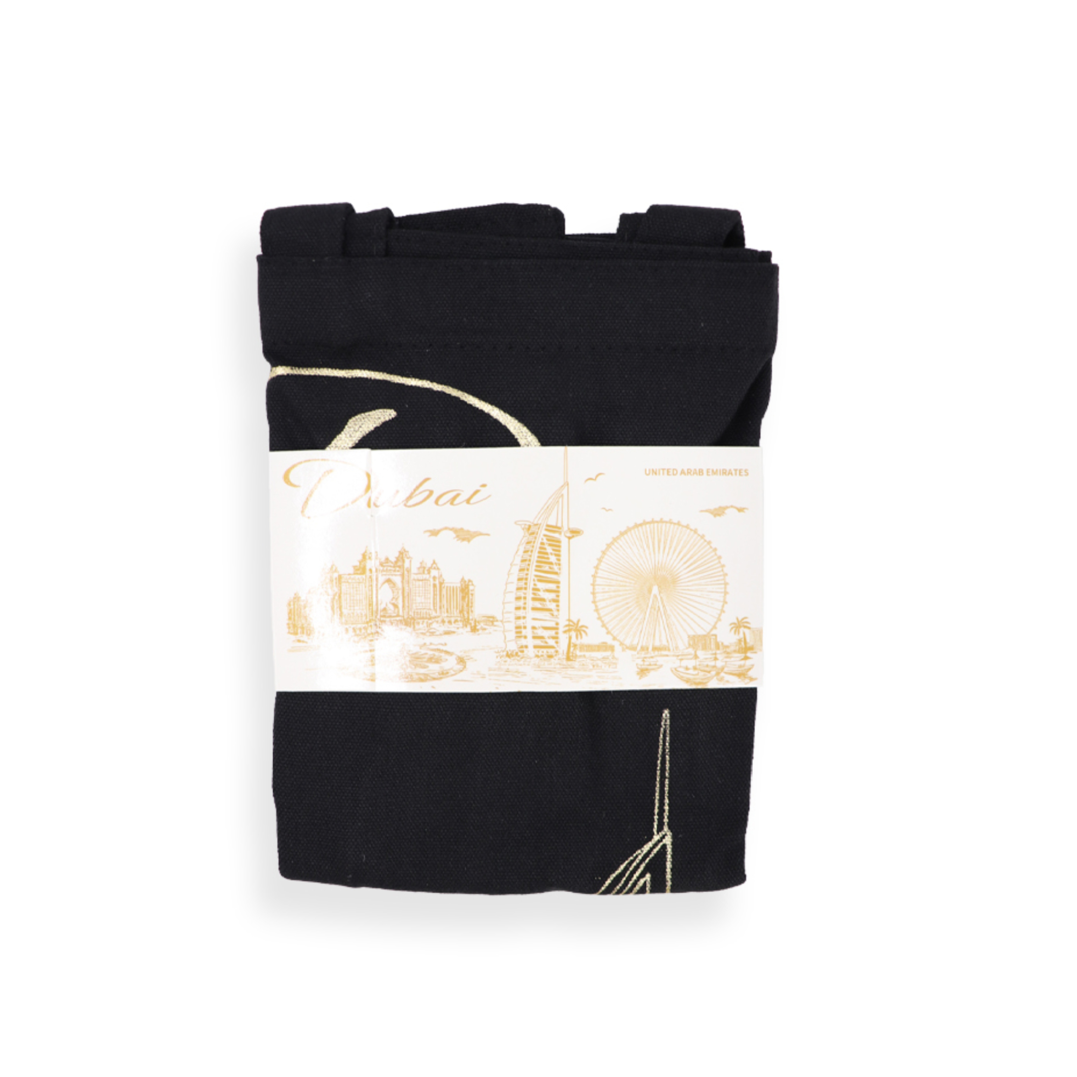 A sophisticated black canvas tote bag featuring an elegant gold-toned illustration of Dubai’s iconic coastal skyline. This premium souvenir combines the luxury of the city with practical, everyday durability, showcasing world-famous landmarks in a shimmering metallic-style print.