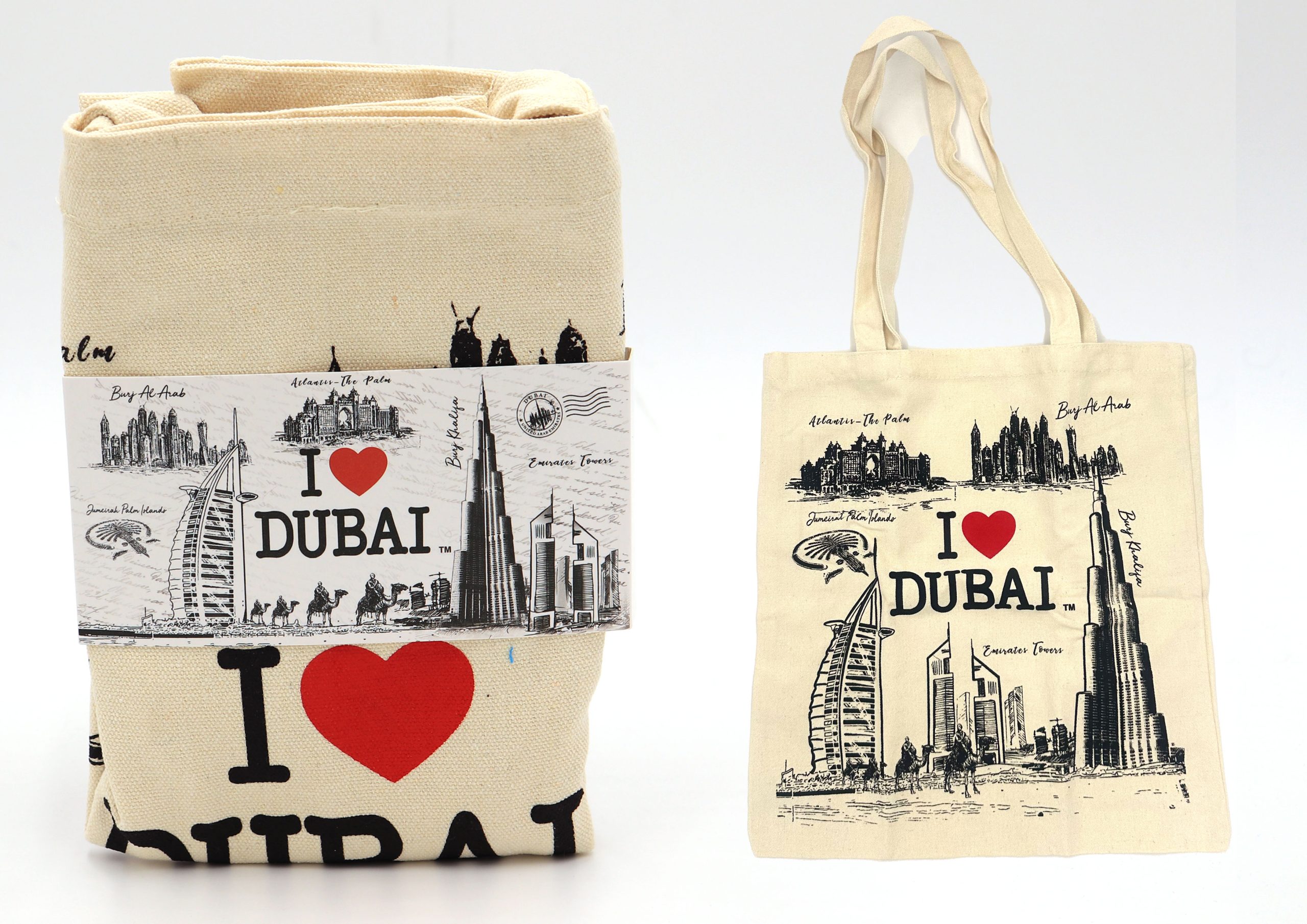 A stylish and durable canvas tote bag featuring an iconic I Love Dubai design. This bag showcases detailed sketches of the city’s most famous landmarks, including the Burj Khalifa and Burj Al Arab. Available in two classic colors, it serves as a practical everyday accessory or a high-quality souvenir.